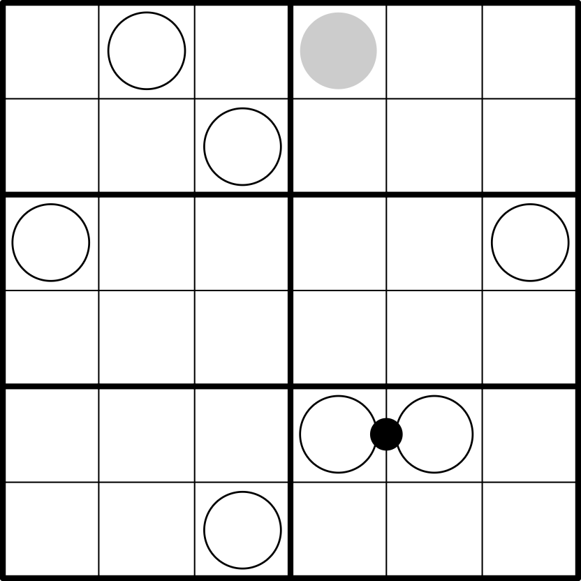 Kropki Dots: Digits separated by a black dot have a 1:2 ratio, meaning one is exactly double the other. Not all dots are necessarily given.