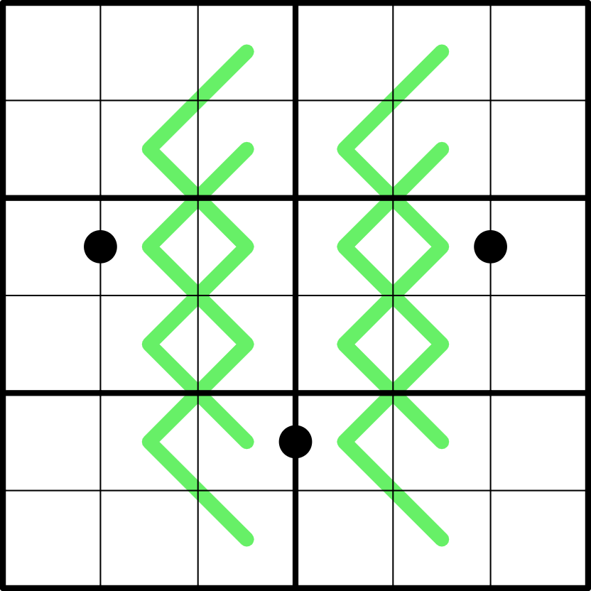 Kropki Dots: Digits separated by a black dot have a 1:2 ratio, meaning one is exactly double the other. Not all dots are necessarily given.