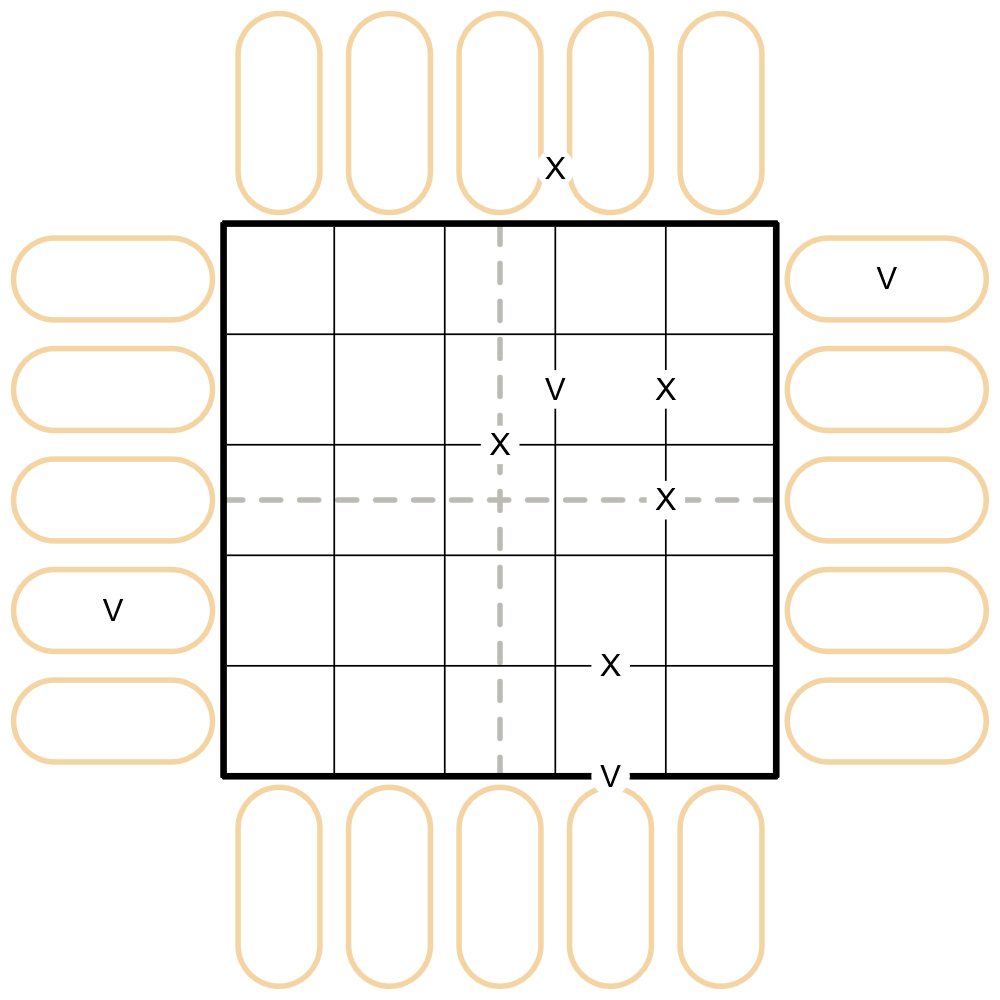 - Spaces joined by a V or X have digits that sum to 5 or 10 respectively. Not all possible such pairs are given.