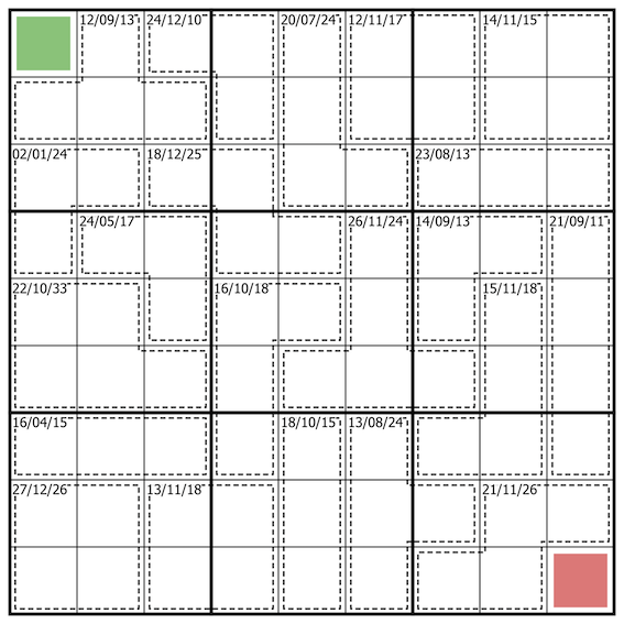 - In graves (cages), values must sum to the day, month or year of the date on the grave. Digits cannot repeat within graves.
