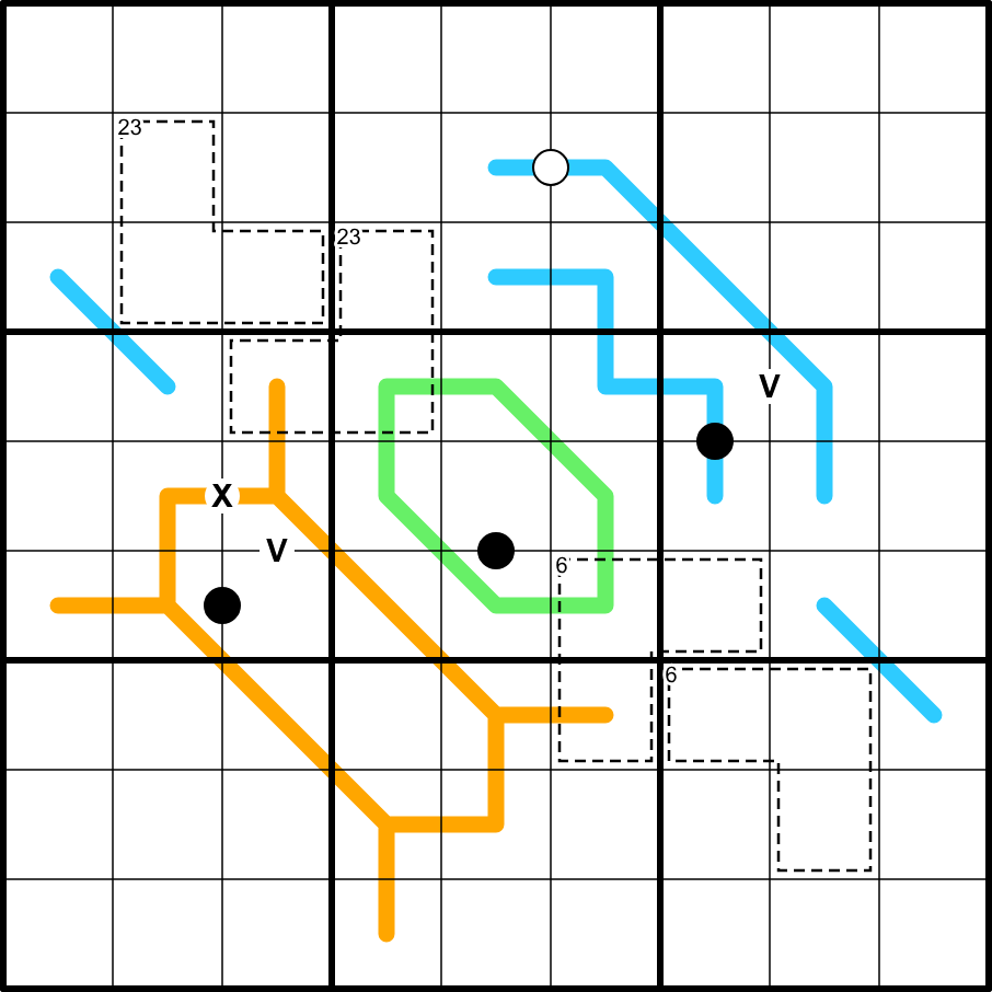 - Region Sum Lines - the digits on a blue Region Sum Line sum to the same amount on either side of a box border.