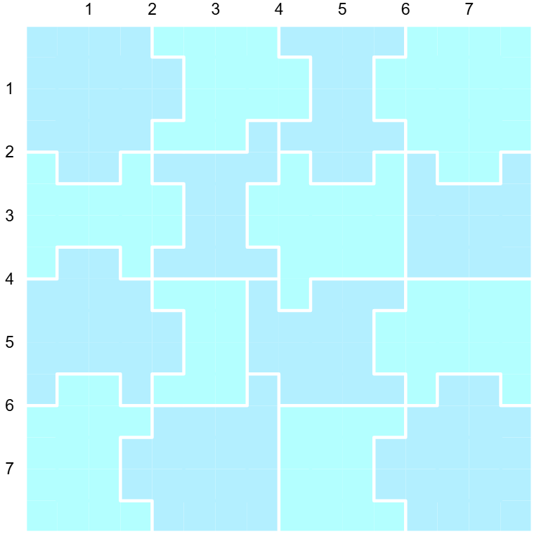 Jigsaw pieces: The grid is covered by 16 jigsaw pieces. Each piece covers the same sum. If a cell is covered by more than one piece, its digit is split between those pieces proportionally to the area covered.