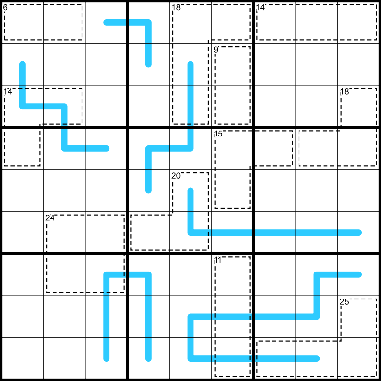 Region Sum Lines: Blue lines are divided by box borders into segments of the same sum. Different lines may have different sums.