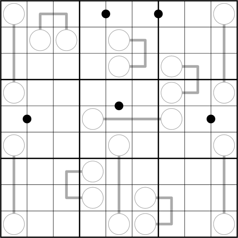Kropki Pairs: Digits separated by a black dot are in a 2:1 ratio.