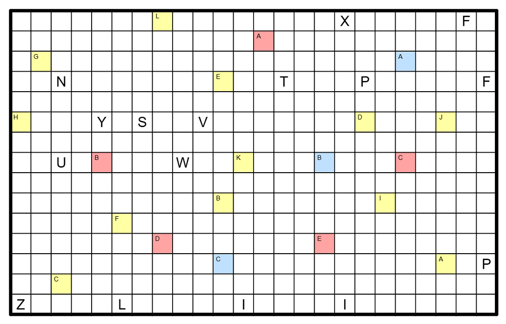 In das Diagramm sind aus zwei Feldern bestehende Dominos auf leeren Feldern zu platzieren, so daß diese die verbleibenden Felder in Gebiete einteilen. Die Dominos dürfen dabei einander nicht orthogonal berühren und auch nicht überlappen. Gleiche Buchstaben müssen im gleichen Gebiet stehen und unterschiedliche Buchstaben in unterschiedlichen Gebieten. Gebiete ohne Buchstaben sind nicht erlaubt.