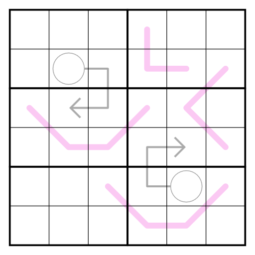 - Normal 6x6 sudoku rules apply, i.e. each row, column, and 2x3 region has to contain the digits from 1 to 6 once each.