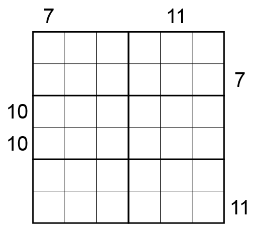 - Periodic Sums: A clue outside the grid indicates the sum of the first cell seen in its row/column and every Nth cell after, where N is the digit in the first cell. If for example r1c1 contains a 2, then the digits in r1c1, r3c1 and r5c1 have to sum to 7.
