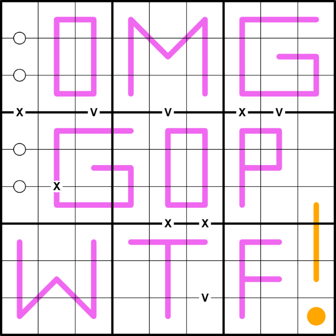 • Digits in cells separated by a "V" must sum to 5, digits in cells separated by an "X" must sum to ten - not all X's and V's are shown