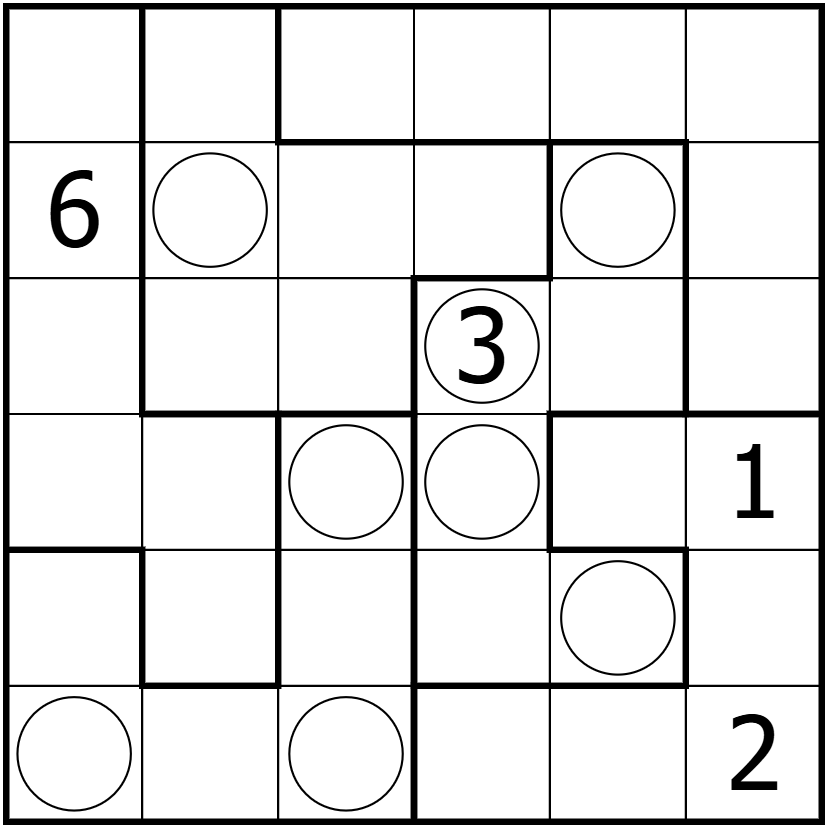 - Chaos Destruction: All given regions must be "destroyed" by making sure they do not contain all the digits 1-6. The grid also consists of six hidden, orthogonally connected regions that each do contain all the digits 1-6. Digits in circles represent how many of its orthogonally and diagonally adjacent cells, including itself, belong to both the given and hidden regions where the circle resides (i.e., where they overlap).