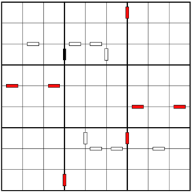(Note: Mirrors do not interact and thus can see "through" each other. So the black mirror, for example, sees exactly three pairs of digits: r3c3:r3c4, r3c2:r3c5, r3c1:r3c6)