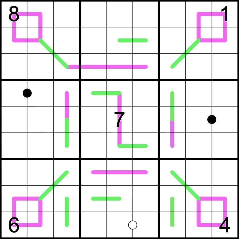 Kropki dots: Digits separated by a black dot must be in a 1:2 ratio. Digits separated by a white dot must be consecutive.