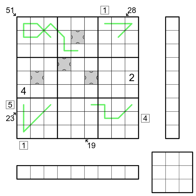 - Clues outside the 9x9 grid accompanied by arrows provide the sum of the indicated diagonal. Digits and values may repeat along a diagonal if allowed by other rules.