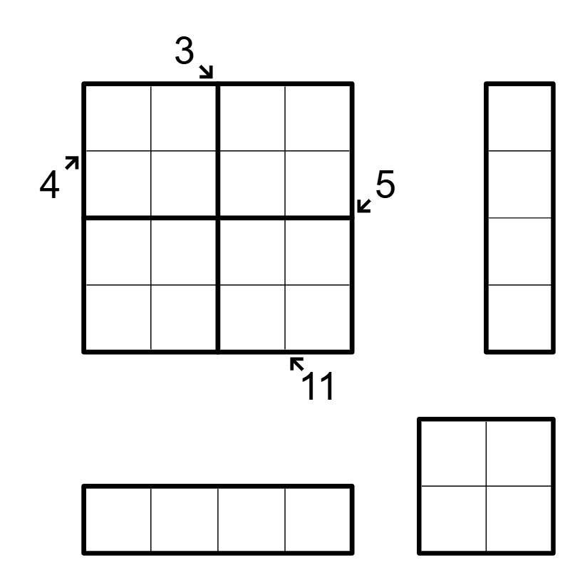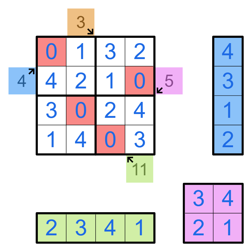- Clues outside the 9x9 grid in squares are numbered rooms clues. The value in the cell closest to the clue indexes the nearest instance of the clue in the row or column. If the clued value does not appear in the row or column, the index will have a value of 0.