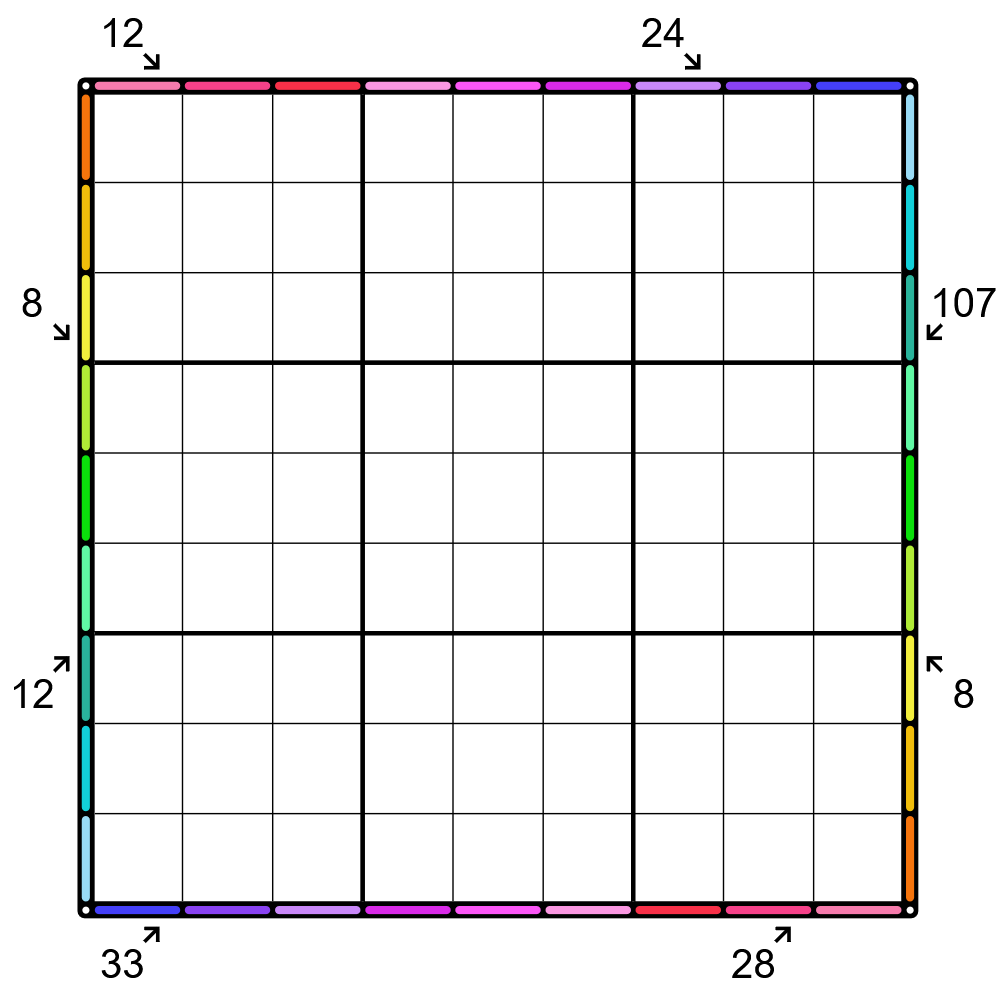 - A number outside the grid indicates the sum of the seen cells along the indicated diagonal.