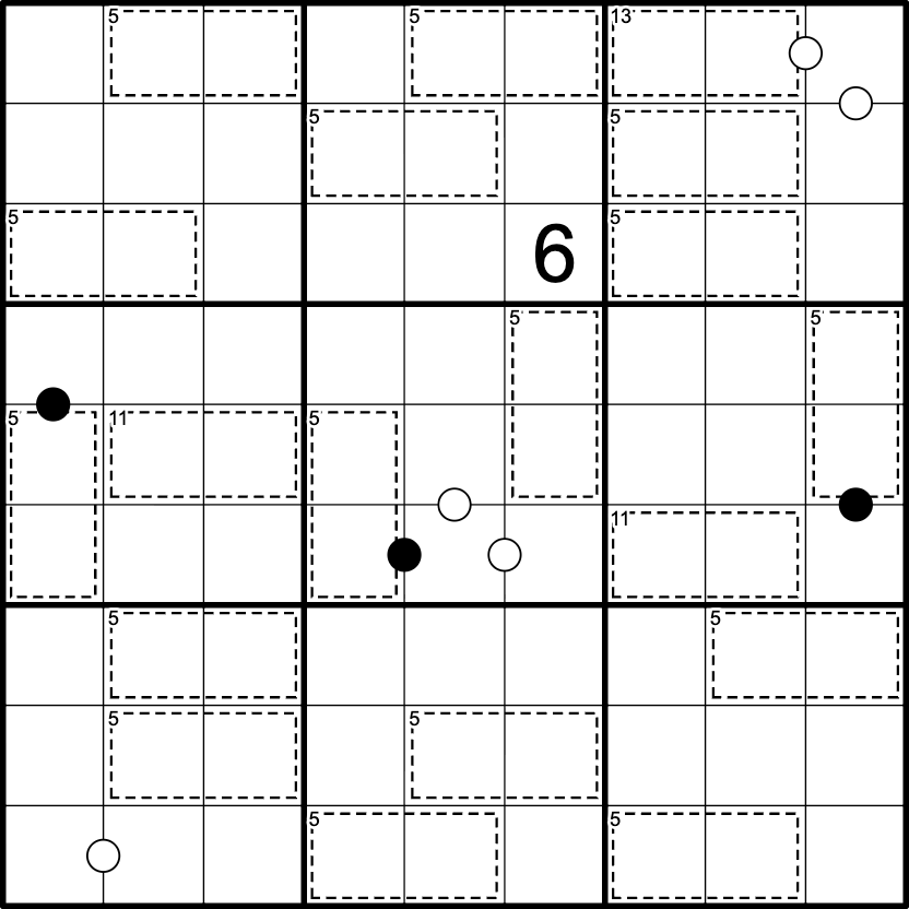 Kropki dots: Digits separated by a black dot must be in a 1:2 ratio. Digits separated by a white dot must be consecutive.