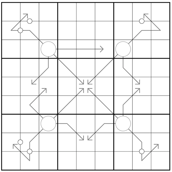 Arrows: Digits on an arrow sum to the digit in the attached circle. All circles have multiple arrows, each arrow individually sums to the circled digit.