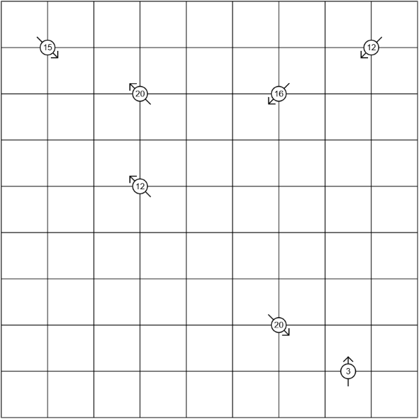 Ever since my puzzle “Chaconopia Whirlwind,” in which I managed to get by with just 9 of these little arrows as clues, I couldn't stop wondering whether it would be possible to do it with even fewer. The fascinating answer: it works with just 7!