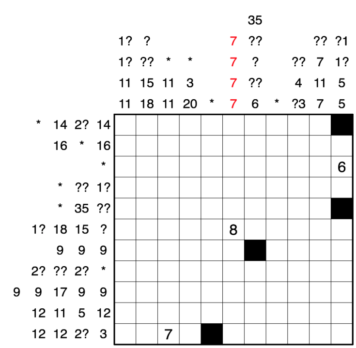Solution code: Row 3, Column 8. X for empty, black cells (also for blackened nines).