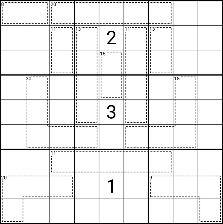 Values inside cages sum to the number in the top left corner of the cage, and values and digits cannot repeat inside a cage.