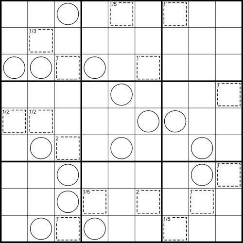 Rules: Normal Sudoku rules apply. A cage represents an object whose mass, m, is given by the clue in the top left corner. If the clue contains a slash, the mass is given in fractional notation (e.g., m = 1/3 means a mass of one third). Each object moves with a velocity, v, given by the digit in the cage, on a circular trajectory around exactly one circled cell that is displaced by r cells either horizontally or vertically from the cage. The circled cell contains as a digit the centripetal force, F = m v2 / r, required to maintain the circular motion of the associated object. The circular trajectory need not be contained fully within the Sudoku grid.