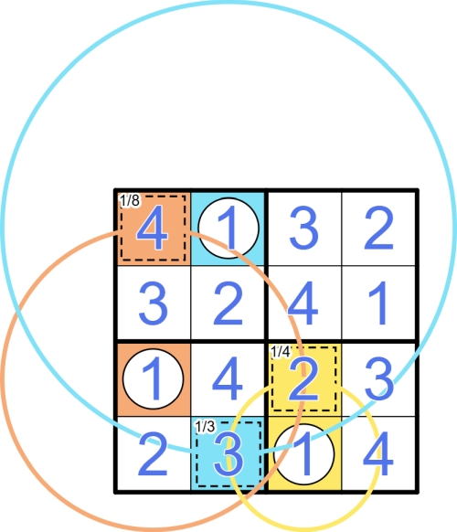 Example: The following image provides a fully solved example on a 4x4 grid. You may solve the example for yourself here on SudokuPad. The large colored circles indicate the circular motion of the objects around their associated force centers in matching colors.