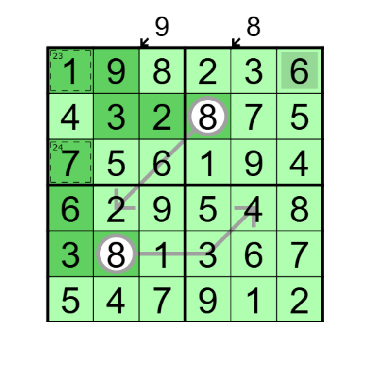 Numbers outside of the grid sum all the cells that is part of cages on the indicated diagonal and counted digits(inside cages) can not repeat.