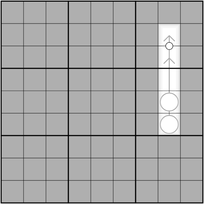 Two Arrow lines are coloured to distinguish the overlapping arrows. All others are grey Arrow lines and it is up to the solver to determine the arrow lines. No overlapped cell is counted more than twice on a single arrow line.