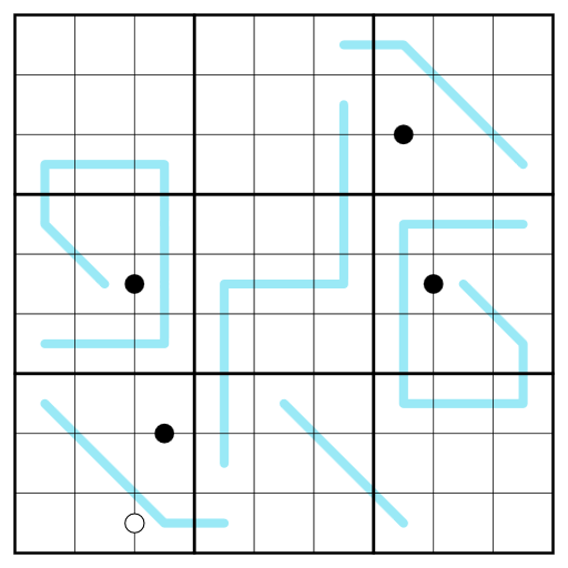 - Kropki: Digits joined by a black dot are in a 1:2 ratio. Digits joined by a white dot are consecutive. (Not all black and white dots are necessarily given.)