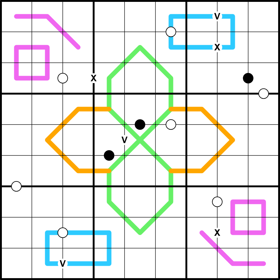 - Kropki - digits separated by a white Kropki dot differ in value by 1; digits separated by a black Kropki dot have a ratio of 2:1. No negative constraint.