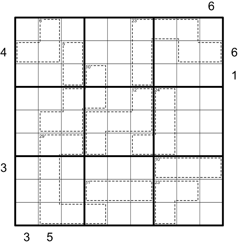 Killer cage(ish): Values in a cage sum to the number in the top left corner of that cage. A single digit cannot occur more than twice in a cage (values can if allowed by other rules).