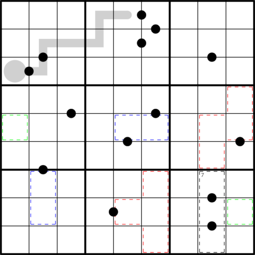 There was lots of radioactive debris from the explosion represented by black dots between every pair of orthogonally adjacent digits in a 1:2 ratio. (All possible black dots are given.)