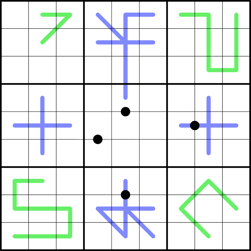 • Adjacent digits along blue Prime Difference Lines must differ by a prime number (0 & 1 are NOT prime).