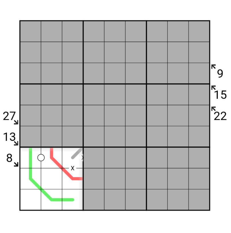 • Digits along diagonals pointed to by arrows outside the grid must sum to the number listed.