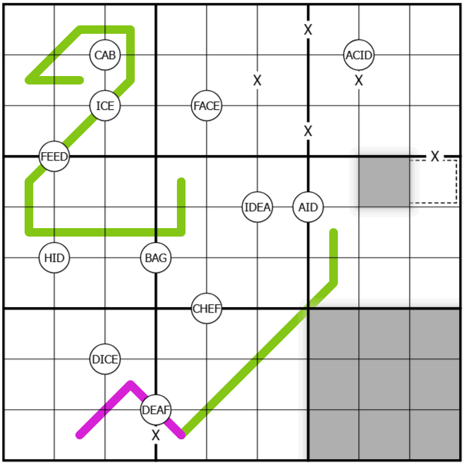 I HID my FACE in the BAG with ICE to cool down after this amzing puzzle. Only real CHEF could come up with such amazing IDEA. Guys, don't be DEAF and hear me out - you don't need to roll a DICE to find a brilliant puzzle to solve - go with this one. Noone will need to come to your AID, as solving this puzzle was like going in the CAB - fast, though exciting. Don't FEED yourself with ACID and rate this extraordinary puzzle as it deserves - very nice!