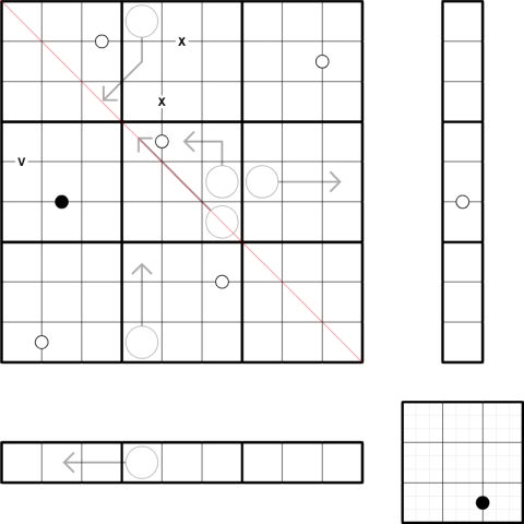• Fill each outer cell with the digit missing from the corresponding row, column or box.