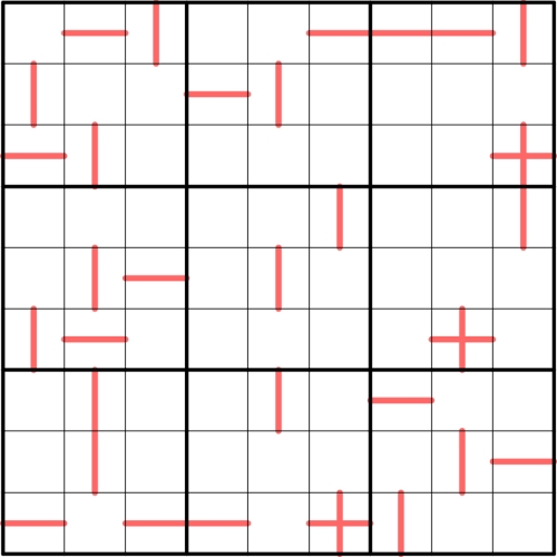 Rules: Normal Sudoku rules apply. A horizontal (vertical) red line across the width of one cell represents a horizontal (vertical) mirror. Each pair of horizontal mirrors displaced vertically by L cells and each pair of vertical mirrors displaced horizontally by L cells forms a laser cavity of length L. For each cavity, the product of the digits in the two mirror cells must be twice the cavity length. If a cell contains both a horizontal and a vertical mirror, its digit must be valid for both associated cavities.