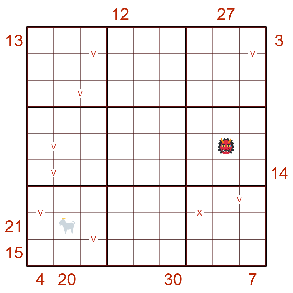 - Each chupacabra cell and cabra cell must contain a different digit from others of its same type.