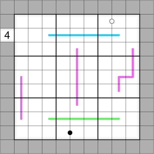 - Kropki Dots: A black dot between cells indicates cell values with a 2:1 ratio. A white dot between cells indicates cells with consecutive values. Not all dots are given.