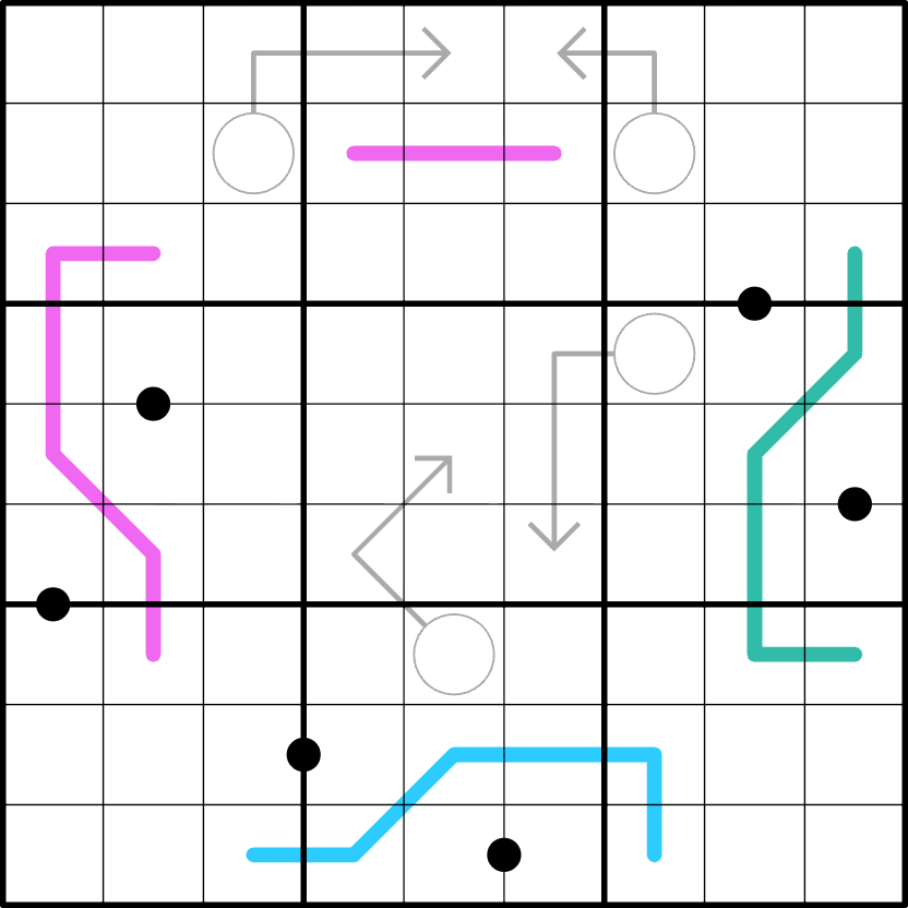 Normal sudoku rules apply. Digits on a pink renban line form a consecutive set in any order. Box borders divide blue lines into regions of equal sums. Every three digit sequence on a teal modular line consists of one digit from each of the sets (1, 4, 7), (2, 5, 8), and (3, 6, 9). A digit on one side of a black kropki dot is double the digit on the other side. Digits on an arrow sum to the digit in the attached circle.