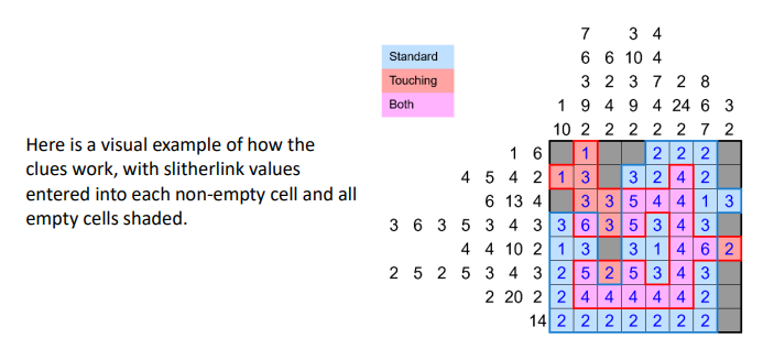 Clues outside the grid indicate the sums of contiguous segments of non-empty cells in that row or column, in the correct order. Loop edges delimit such segments; there may be one or more empty cells between segments, but there need not be. Clue colors are aesthetic only.