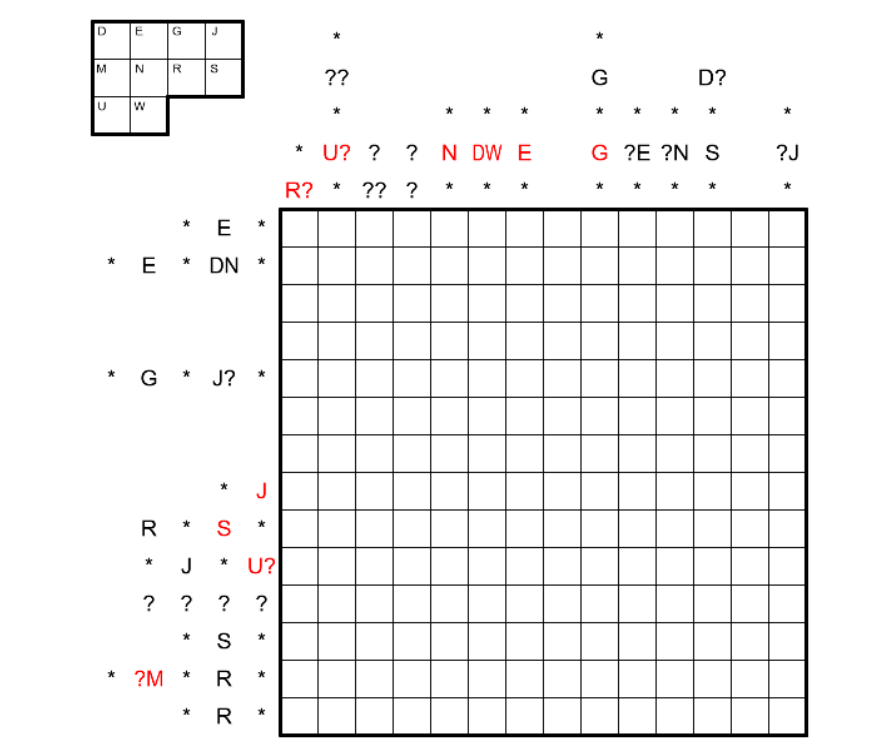 Each letter represents a different digit from 0 to 9. A "?" stands for any digit, though a double-digit number may not start with zero. A "*" represents any number of clues, including none