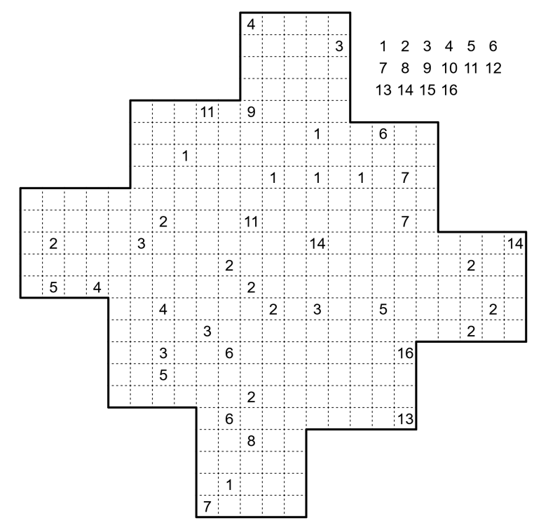 In keeping with the annual tradition, the tireless gnome was busy preparing his series of gifts. And this time the recipient was none other than Plough Imp, the inventor of a new and eye-catching genre. As the gnome sat at his drawing board, he had an idea. He began by sketching a Cave, with standard shading rules and clues on the inside of the cave. But then he continued by decorating the walls of the cave with the invention of Plough Imp, thereby ensuring that the Walls had sizes of 1-16, once each. This would certainly be a fitting gift for his puzzle friend!