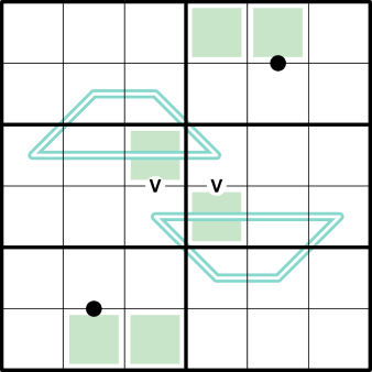 • Digits separated by a black dot contain digits where one is double the other; not all black dots are necessarily given. Digits separated by a V sum to 5.