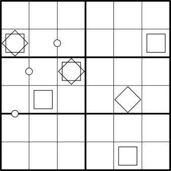 • In each grid, the circles contain a complete set of the digits 1-6. For each pair of circles in the same position, the digit is the same. In one grid the value of the cell is doubled; in the other the value is unchanged (the doublers are not necessarily all in the same grid). It is up to the solver to determine in which grid each digit is doubled.