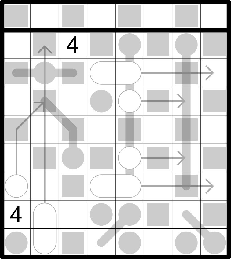 Place each number 1-8 on the main grid 8 times. Each digit secretly represents a chess piece. There is one king and queen, and 2 each of rooks, bishops, and knights. No digit is able to attack itself. For example, if 3 is a rook, no 3 may share a row or column with another 3. In the top row, place the "chess pieces" in order- RNBKQBNR. The top row does not interact with main grid. No row or column may contain more than 2 of the same digit.