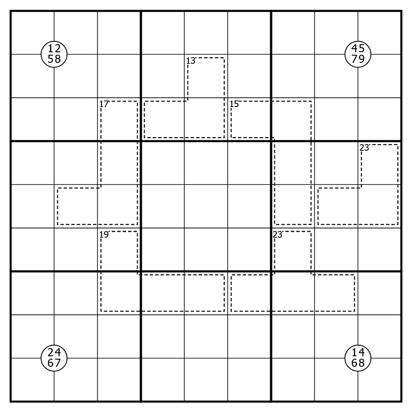 Digits appearing in large circles (on grid intersections) must appear in the surrounding four cells.