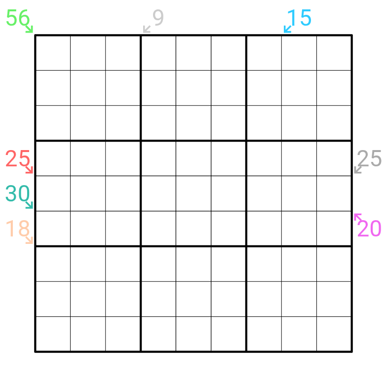 Little Killers: Clues outside the grid give the sum of the digits along the indicated diagonal. Digits may repeat if allowed by sudoku and line rules. Each Little Killer also must follow the specific special rule (1-8) listed below: