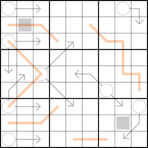 Entropic lines: along orange lines, every set of three adjacent cells contains one low digit (1-3), one middle digit (4-6), and one high digit (7-9).