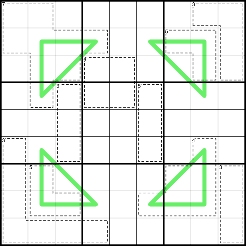 Modular Cages: The digits inside each dashed line cage must sum to a multiple of the small clue at the top left corner of the cage. Digits may repeat within a modular cage if allowed by other rules.