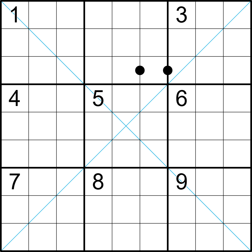 Kropki dots: Digits in cells joined by a black dot are in a 1:2 ratio (i.e., one digit will be double the other). Not all dots are given.